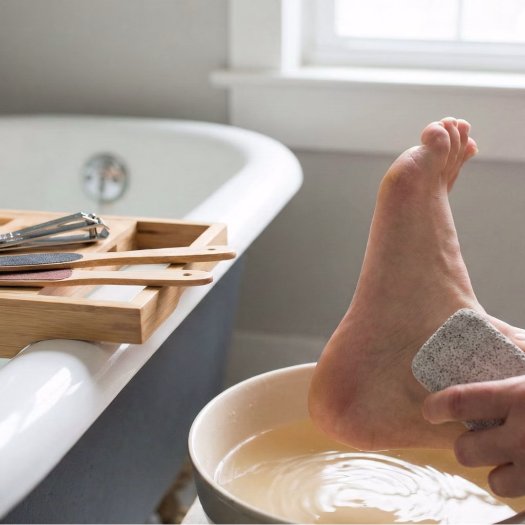 - Soak & Soften: Start with a 10–15 minute soak in warm (never hot) water. Adding Epsom salts can help soothe tired muscles, while a few drops of essential oil like lavender or tea tree provides an antimicrobial boost.